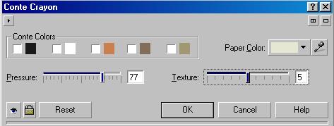 Выбрав команду Conte Crayon (Специальные мелки), вы сможете получить рисунок мелками (Рис. 18.10, второй слева). После выбора команды на экране появится диалог настройки эффекта (Рис. 18.12). Если вы не установите флажки рядом с образцами цветов в верхней части диалога, при создании рисунка будут использоваться оригинальные цвета изображения. Установив флажки, вы можете использовать от одного до пяти цветных мелков. Цвет холста устанавливается в поле, расположенном в правой части диалога. Ползунок Pressure (Давление) определяет степень нажатия мелков на холст. При большем нажатии получаются более контрастные рисунки. Ползунок Texture (Текстура) позволяет установить степень проявления текстуры поверхности. Сильно текстурированная поверхность может отвлекать от основного рисунка, поэтому не рекомендуется злоупотреблять этой возможностью.