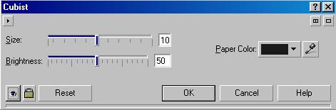 Получить картину в стиле кубизма (Рис. 18.10, справа) можно с помощью команды Cubist (Кубизм). В диалоге настройке эффекта (Рис. 18.14) устанавливается размер мазков с помощью ползунка Size (Размер) и яркость картины с помощью ползунка Brightness (Яркость). В поле Paper Color (Цвет бумаги) выбирается цвет бумаги, на котором рисуется иллюстрация.