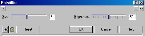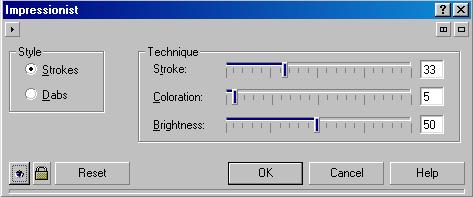 Для получения эффекта следует выбрать команд Impressionism (Импрессионизм). В диалоге выбирается стиль мазков. В переключателе Style (Стиль) нужно выбрать стиль Strokes (Штрихи) или Dabs (Пятно). Различные стили помогут создать совершенно разные рисунки. С помощью верхнего ползунка выбирается размер мазков, ползунок Coloration (Окраска) задает степень разброса цветов, а с помощью ползунка Brightness (Яркость) устанавливается яркость полученного рисунка.