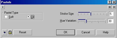 Пастельный рисунок (Рис. 18.15, второй справа) выполняется с помощью команды Pastels (Пастель). В диалоге (Рис. 18.18) установкой переключателя в положение Soft (Мягкий) или Oil (Масло) выбирается тип пастели. Ползунком Stroke Size (Размер штрихов) устанавливается размер штрихов в создаваемом рисунке, а с помощью ползунка Hue Variation (Изменение цвета) задается разнообразие цветов в рисунке. Пастельные рисунки могут быть очень красивы.