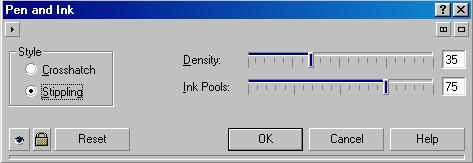 Черно-белый рисунок, выполненный с помощью перьевой ручки (Рис. 18.15, справа), получается с помощью команды Реп & Ink (Ручка и чернила). На экране появится диалог настройки эффекта (Рис. 18.19). Переключателем в правой части диалога выбирается стиль рисунка. Варианты Crosshatch (Штриховка) и Stippling (Пунктир) задают разный вид штрихов, и в результате мы получаем совершенно непохожие друг на друга рисунки. Ползунком Density (Плотность) задается плотность чернил. Ползунком Ink Pool (Пул чернил) задается количество используемых чернил.