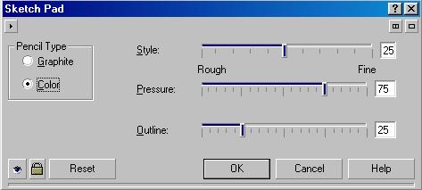 Другой эффект (Рис. 18.21, справа) можно получить, выбрав команду Sketch Pad (Доска наброска). В диалоге настройки (Рис. 18.23) вы можете существенно изменить внешний вид получаемого рисунка. Установив переключатель в положение Graphite (Графитовый), вы создадите черно-белый рисунок, а в положение Color (Цветной) - цветной. С помощью ползунка Style (Стиль) настраивается стиль выполняемых мазков. Ползунок Pressure (Давление) определяет степень нажатия на доску при рисовании. Кроме того, можно установить с помощью ползунка Outline (Контур) толщину линий контура.