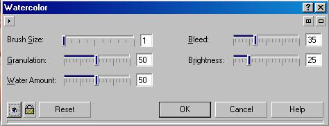 В диалоге настройки эффекта (Рис. 18.25) вы можете настроить пять параметров. Ползунок Brush Size (Размер кисти) задает размер мазков, а ползунком Granulation (Гранулирование) задается пятнистость рисунка. Ползунок Water Amount (Количество воды) определяет интенсивность цветов. С помощью ползунка Bleed (Расплывание) можно создать более размытое изображений. Ползунком Brightness (Яркость) регулируется яркость рисунка.