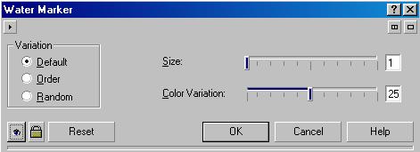 Оригинальный эффект (Рис. 18.24, в центре) достигается при выборе команды меню Water Marker (Водный маркер). В диалоге настройки эффекта (Рис. 18.26) вы можете выбрать один из трех вариантов эффекта. Варианты Default (По умолчанию). Order (Порядок) и Random (Случайно) описывают различное расположение мазков в рисунке. С помощью ползунка Size (Размер) устанавливается размер мазков. Ползунком Color Variation (Изменение цвета) задается степень разнообразия цвета в соседних мазках.