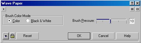 Не менее оригинален эффект (Рис. 18.24, справа), получаемый при выборе команды Wave Paper (Волнистая бумага). В диалоге настройки (Рис. 18.27) вы можете выбрать цветной рисунок, установив переключатель в положение Color (Цветной), или черно-белый, установив переключатель в положение Black & White (Черно-белый). Ползунок Brush Pressure (Давление кисти) определяет степень нажатия кисти на бумагу при рисовании. Чем сильнее кисть давит на бумагу, тем более интенсивные цвета получаются в рисунке. Однако при любых установках цвета окажутся бледнее, чем в оригинале.
