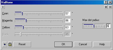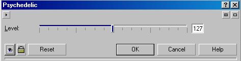 В диалоге настройки (Рис. 18.40) вы определяете размеры полутоновых точек с помощью ползунка Мах dot radius (Максимальный радиус точки). Кроме того, остальные ползунки задают углы поворота точек для каждого цветового канала. Для замены цветов на яркие, кричащие тона используется следующий эффект (Рис. 18.38, второй справа), который вызывается командой Psychedelic (Психоделический). В диалоге (Рис. 18.41) задается уровень изменений цвета. Передозировка эффекта может вызвать неприятные ощущения, поэтому лучше устанавливать небольшие значения уровня.