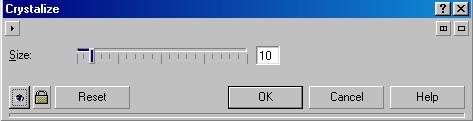 Создать рисунок из кристаллов (Рис. 18.48, второй слева). Можно с помощью команды Crystalize (Кристаллизация). В диалоге настройки эффекта (Рис. 18.50) с помощью ползунка Size (Размер) вы можете установить нужный размер кристаллов.