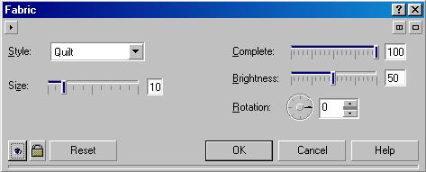 Вы можете легко имитировать рисунок, нанесенный на ткань (Рис. 18.48, второй справа). Эффект вызывается командой Fabric (Ткань). В диалоге настройки эффекта (Рис. 18.51) в списке Style (Стиль) выбирается конкретная ткань. В зависимости от выбранной ткани, вы можете получить разнообразные рисунки. Доступны шесть типов ткани, каждый из которых имеет свой уникальный вид. С помощью ползунка Size (Размер) устанавливается величина стежков, а ползунком Complete (Полнота) задается процент заполнения рисунка. В поле Brightness (Яркость) задается яркость, а с помощью Rotation (Вращение) элементы рисунка можно повернуть.