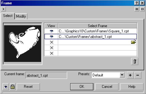 Создать красивую рамку для рисунка (Рис. 18.48, справа) можно с помощью команды Frame (Рамка). Примерно такого же эффекта можно добиться применением фигурной обрезки. Однако художественный эффект Frame (Рамка) предоставляет некоторые дополнительные возможности. В диалоге настройки эффекта на вкладке Select (Выбор) (Рис. 18.52) выбирается одна из установленных в системе рамок. Вы можете открыть созданный ранее графический файл, в котором сохранена рамка. Вместе с CorelDRAW 10 поставляется набор художественных рамок.