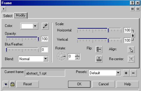 Если вы хотите настроить использование рамки, перейдите на вкладку Modify (Изменить) диалога (Рис. 18.53). На этой вкладке вы можете изменить масштаб, цвет и прозрачность рамки, а также размыть ее края.