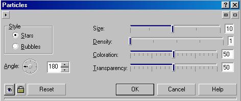 Добавить к рисунку случайные элементы (Рис. 18.54, справа) можно с помощью команды Particles (Частицы). В диалоге настройки эффекта (Рис. 18.58) с помощью ползунка Size (Размер) задается размер частиц, а с помощью ползунка Density (Плотность) - их количество. Ползунком Coloration (Окраска) задается разброс цветов, а с помощью ползунка Transparency (Прозрачность) устанавливается прозрачность частиц. Переключатель Style (Стиль) можно установить в положение Bubbles (Пузырьки) или Stars (Звезды), чтобы добавить выбранный вид частиц. В поле Angle (Угол) задается угол наклона частиц.