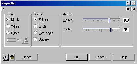 Виньетку для фотографии (Рис. 18.63, слева) можно сделать командой Vignette (Виньетка). В диалоге настройки эффекта (Рис. 18.64) выбирается цвет полей в группе полей Color (Цвет) и форма виньетки в группе полей Shape (Форма). Ползунком Offset (Смещение) выбирается расположение полей, а ползунком Fade (Переход) устанавливается плавный переход от рисунка к закрашенному полю. Если вам не требуется плавный переход, то аналогичный результат можно получить, разместив над растровым рисунком векторный объект с отверстием нужной формы и размера.