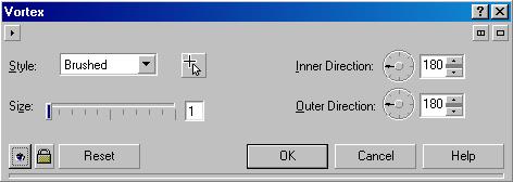 Рисунок из множества завитков (Рис. 18.63, в центре) получается при использовании команды Vortex (Завихрения). В диалоге настройки эффекта (Рис. 18.65) выбирается стиль завихрений с помощью списка Style (Стиль). Различные стили сильно отличаются друг от друга. Ползунком Size (Размер) задается размер отдельных завитков. Элементы Inner Directional (Внутреннее направление) и Outer Directional (Внешнее направление) позволяют задать направления для создаваемых элементов.