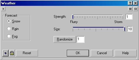 Чтобы добавить погодные особенности (Рис. 18.63, справа) к рисунку, следует вызвать команду Weather (Погода). В диалоге настройки эффекта (Рис. 18.66) вы можете выбрать один из вариантов: Snow (Снег), Rain (Дождь) или Fog (Туман). Ползунком Strength (Сила) задается интенсивность непогоды, а с помощью ползунка Size (Размер) задается размер снежинок или капель. Нажимая кнопку Randomize (Рандомизировать), вы меняете случайные места, где будут расположены добавляемые объекты.