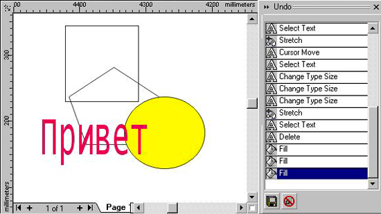 Такие рамки называются закреплениями (Dockers). Их название связано с тем, что они при открытии закрепляются у одной из сторон редактируемого документа. В правой части закрепления видны ярлычки, щелкая мышью на которых, можно вызвать то или иное закрепление. Большинство действий в редакторе можно выполнить с помощью закреплений, которых в CorelDRAW 10 достаточно много. Несколько закреплений могут располагаться выше и ниже, а также перекрывать друг друга. При этом для выбора конкретного закрепления следует щелкнуть мышью на его ярлычке. Нажав кнопку "Forward" расположенную в заголовке закрепления, вы свернете его в узкую полосу рядом с цветовой палитрой, а нажав кнопку "Back" - развернете обратно, убрать закрепление можно, нажав кнопку "Close" в его заголовке. В закреплении для отмены последних действий выводится список всех выполненным вами операций. Отмененные операции выделены серым фоном и расположены в нижней части списка. Негативом выделена последняя выполненная и не отмененная операция. Щелкнув мышью на любом элементе списка, вы отмените или восстановите несколько действий, от выбранного до последнего. Если вы открыли файл для редактирования и выполнили много изменений, но потом решили отказаться от них, вам следует воспользоваться другой возможностью редактора CorelDRAW 10. Выбрав команду меню F ile Revert (Файл Возвратиться), вы восстановите состояние документа, каким он был сохранен на диске. В диалоге вас попросят подтвердить восстановление. Нажав кнопку ОК, вы безвозвратно удалите все изменения, последовавшие после последнего сохранения файла.