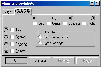 Щелкните мышью на ярлычке Distribute (Распределить), чтобы перейти на одноименную вкладку диалога (Рис. 5.2, ). Установите флажок Spacing (Интервал) в левой части диалога, чтобы расположить объекты по вертикали через одинаковые интервалы. Закройте диалог с помощью кнопки ОК. Выделенные объекты будут выровнены по горизонтальной линии, которая проходит через их центр, и расположены через одинаковые интервалы. Выделите два правых объекта из верхней строки, а затем нажмите клавишу Shift и щелкните мышью на первом объекте в строке, чтобы выделить и его. Мы выделили последним первый объект, чтобы выравнивание проводилось по нему, а он не менял бы свое положение. Снова нажмите кнопку "Aling a nd Distribute" панели Property Bar (Панель свойств) и на экране опять появится диалог Align and Distribute (Выровнять и Распределить). Установите флажок left (По центру) в левой части диалога, перейдите на вкладку Distribute (Распределить) и установите флажок Spacing (Интервал) в верхней части диалога, после чего закройте диалог с помощью ОК. Выделенная строка объектов будет выровнена по вертикали относительно центра первого объекта. Кроме того, объекты будут расположены по горизонтали через одинаковые интервалы. Мы расположили первый столбец и первую строку, а теперь надо выровнять по ним остальные объекты. Выделите два правых объекта из второй строки, а затем нажмите клавишу Shift и щелкните мышью на первом объекте в строке. Нажмите кнопку "Aling and Di s tribute" и в появившемся диалоге установите флажок left (По центру) в левой части диалога, после чего нажмите кнопку ОК. Вторая строка выровнена по вертикали, однако, по горизонтали объекты остались не выровненными. Аналогичным образом выровняйте последнюю строку. Выделите два нижних объекта из второго столбца, а затем нажмите клавишу Shift и щелкните мышью на верхнем объекте в столбце. Нажмите кнопку "Aling and Distribute" и в появившемся диалоге установите флажок left (По центру) в верхней части диалога, после чего нажмите кнопку ОК. Два объекта второго столбца теперь выровнены по верхнему объекту. Аналогично выровняйте объекты последнего столбца. Все наши объекты теперь расположены симметрично и на равном расстоянии друг от друга. Без средств автоматизации получить такой рисунок было бы достаточно трудно. Однако с помощью CorelDRAW 10 взаимное выравнивание объектов происходит очень просто. Выравнивать объекты можно не только друг относительно друга, но и относительно центра страницы. Выделите все девать объектов, а затем нажмите кнопку "Aling and Distribute". Установите флажок left of Page (По центру страницы), после чего нажмите кнопку Preview (Просмотр). Все выделенные объекты будут размещены в центре страницы, друг на друге. Если вам не видны объекты из-за диалога, перетащите его в сторону, взявшись за заголовок диалога. Так как нам не нужно размещение всех объектов в одном месте, нажмите кнопку Cancel (Отмена), диалог закроется и все объекты вернуться на свои места. Чтобы выровнять не каждый объект отдельно, а все объекты как единое целое, надо объединить их в группу, о чем и будет рассказано ниже.