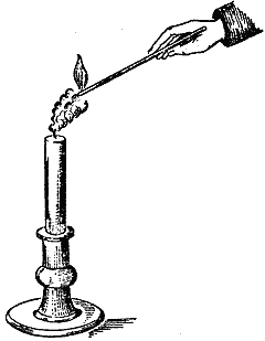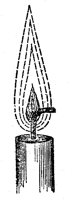 Вернемся теперь к вопросу, почему свеча не горит вдоль всего фитиля. Единственная причина этого в том, что растопленное сало гасит пламя. Вы знаете, что если опрокинуть свечку так, чтобы горючее стекало на фитиль, свечка погаснет. Причина этого в том, что пламя не успело нагреть горючее настолько, чтобы оно могло гореть, как это происходит наверху, где горючее поступает в фитиль в небольшом количестве и подвергается полному воздействию пламени. Есть еще одно обстоятельство, с которым вы должны познакомиться, и притом такое, без которого невозможно до конца разобраться в природе свечи, - а именно газообразное состояние горючего. Для того чтобы вы могли это понять, я покажу вам очень изящный опыт из повседневной жизни. Если вы умело задуете свечу, от нее поднимется струйка паров. Вы, конечно, хорошо знакомы с запахом задутой свечки, и это действительно неприятный запах. Но если вы ловко ее задуете, вы сможете хорошо рассмотреть эти пары, в которые превращается твердое вещество свечи.