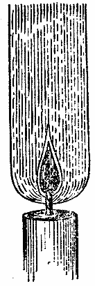 В зале у нас изрядный сквозняк; при некоторых опытах он нам будет помогать, а при других - мешать. Поэтому сейчас, для большей равномерности и для упрощения дела, я устрою так, чтобы пламя было спокойным. Ведь как можно что-нибудь изучать, когда мешают трудности, не относящиеся к делу? Мы воспользуемся одним хитроумным приспособлением, которым я часто любовался на тележках рыночных и уличных торговцев овощами или рыбой, когда по субботам торговля затягивается затемно. Вот оно - на свечку надето нечто вроде кольца, поддерживающего ламповое стекло; по мере сгорания свечи все это устройство можно передвигать. Таким образом, благодаря ламповому стеклу получается спокойное, устойчивое пламя, которое можно внимательно разглядывать, что, я надеюсь, вы сделаете у себя дома.