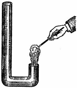 Зажигая этот спирт, получаем подкрашенное пламя; вы видите, я держу его в воздухе, и оно, естественно, устремляется вверх. Теперь вам вполне понятно, почему в обычных условиях пламя направляется вверх. Это зависит от тока воздуха, благодаря которому происходит сгорание. А теперь посмотрите: я дую на пламя сверху и таким изменением тока воздуха заставляю его устремиться вниз, в эту коленчатую стеклянную трубку. По ходу этих лекций мы еще вам покажем такую лампу, где пламя идет вверх, а дым - вниз, или же пламя идет вниз, а дым - вверх.Итак, вы видите, что мы можем придавать пламени различные направления.