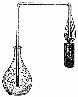 Вот в этой склянке я нагрею воск, чтобы он стал таким же горячим, как внутренность пламени этой свечи и вещество, окружающее фитиль. (Лектор кладет в склянку немного воска и нагревает его над горелкой.) Теперь, пожалуй, колба нагрета достаточно. Вы видите, что воск, который я туда положил, стал жидким и от него идет дымок. Сейчас будут подниматься пары. Продолжаю нагревание; теперь паров получается больше, вот я даже могу перелить пары из колбы в эту чашку и там их поджечь. Стало быть, это в точности те же пары, как в середине пламени свечи. Чтобы вы могли убедиться, что это действительно так, давайте выясним, не собраны ли у нас вот в этой колбе настоящие горючие пары из середины пламени свечи. (Лектор берет колбу, в которую была проведена трубка от свечи, и вводит в нее зажженную лучинку.) Видите, как эти пары горят. Итак, это у нас пары из середины пламени свечи, возникшие благодаря его собственному жару. Это один из первых фактов, которые вы должны продумать в связи с продвижением воска в процессе его горения и с теми переменами, которым он подвергается.