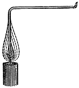 На прошлой лекции мы рассмотрели общие свойства и расположение жидкой части свечи, а также и то, каким образом эта жидкость попадает туда, где происходит горение. Вы убедились, что когда свеча хорошо горит в спокойном воздухе, пламя всегда имеет форму вытянутого вверх язычка, т.е. форму более или менее постоянную и притом очень интересную. А теперь я обращу ваше внимание на то, какими средствами мы можем выяснить, что происходит в той или иной части пламени, почему это происходит, какое действие оно при этом оказывает и, наконец, куда девается вся свеча - ведь вы же прекрасно знаете, что зажженная свеча (если она хорошо горит) на наших глазах, сгорая, исчезает целиком, не оставляя в подсвечнике никаких следов, а это весьма любопытное обстоятельство. Чтобы тщательно исследовать свечу, я собрал несколько приборов, с применением которых вы познакомитесь по ходу лекции. Вот свеча; кончик этой стеклянной трубки я сейчас помещу в середину пламени, т. е. в ту часть его, которая на рисунке старины Гукера изображена сравнительно темной и которую вы всегда можете увидеть, если внимательно посмотрите на пламя (и при этом не будете колыхать его своим дыханием). Эту темную часть мы исследуем прежде всего.