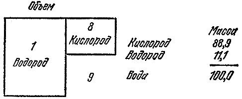 Ну, а что же находится в другом цилиндре? Вы знаете, что оба газа вместе дают взрывчатую смесь. Но что же представляет собой вторая составная часть воды и благодаря которой, следовательно, горит водород? Мы знаем, что вода, налитая нами в сосуд, состояла из совокупности этих двух веществ. Мы убедились, что одно из них - водород; но что же представляет собой второе вещество, которое до опыта находилось в воде, а теперь есть у нас в изолированном виде? Я введу в этот газ зажженную лучинку. Сам газ не будет гореть, но он заставит гореть лучинку (вносит в газ зажженную лучинку). Вот видите, как он усиливает горение дерева, как он заставляет лучинку гореть несравненно ярче, чем на воздухе. Итак, у нас здесь в чистом виде то второе вещество, которое содержится в воде и которое, когда вода образовалась при горении свечи, было, очевидно, взято из окружающего воздуха. Как же мы его назовем? А, В или С? Давайте назовем его О, назовем его кислородом. Имя очень хорошее, характерно звучащее. Итак, значит, это кислород присутствовал в воде и составлял такую значительную часть ее.Теперь мы сможем яснее понимать наши опыты и исследования: ведь когда мы все это хорошенько продумаем, мы сразу сообразим, почему свеча горит в воздухе. Разделив воду на составные части при помощи электричества, мы получаем два объема водорода и один объем вещества, сжигающего водород. Это соотношение объемов представлено на следующей схеме, где указаны также и массы этих составных частей. Отсюда видно, что кислород - второй составной элемент воды - вещество очень тяжелое по сравнению с водородом.