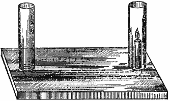 Для большей ясности и убедительности я придумал небольшой прибор, который мы сейчас перед вами смонтируем. Вот доска с вырезанным желобком, который можно накрыть планочкой; концы желобка выходят на поверхность, и продолжениями их служат широкие стеклянные трубки; воздух свободно проходит сквозь весь прибор. В одну из трубок я ставлю зажженную свечу. Вы видите, что она продолжает прекрасно гореть. При этом воздух, питающий пламя кислородом, спускается в трубку на одном конце прибора, проходит вдоль по горизонтальному желобку и поднимается к той трубке, где помещена свечка. Если я закрою входное отверстие, прекратится доступ воздуха, а с ним и горение, - как видите, свечка гаснет.