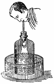 Следующий опыт, который я вам покажу, - это весьма важный шаг в нашем рассуждении. Вот в этой банке, не имеющей дна, содержится чистый воздух, как вы можете заключить из того, что в нем может гореть свеча или газовый рожок. Теперь я этот воздух временно изолирую: банку я ставлю в воду, а горлышко плотно затыкаю пробкой, сквозь которую проходит трубочка. Таким образом, вы видите, я смогу, взяв в рот трубочку, вдохнуть этот воздух, т. е. вобрать его в свои легкие, а затем вновь выдохнуть его в эту банку; тогда мы сможем его исследовать и выяснить, каков получился результат.Вот, следите, - я сперва вобрал в себя воздух, а затем его выдохнул; это видно было из того, что уровень воды сперва поднялся, а затем опустился до прежней высоты. Теперь, введя в банку горящую лучинку, мы сможем судить, в каком состоянии находится там воздух, по тому, что огонек погаснет. Как видите, уже одного вдоха и выдоха оказалось достаточно, чтобы сделать этот воздух совершенно непригодным для горения, так что мне нет смысла вдыхать его вторично.
