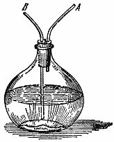 Чтобы немного продолжить эту нить рассуждения, посмотрим, что будет происходить с известковой водой. В эту колбу налито немного известковой воды; сквозь пробку колбы проходят две трубки; через них воздух внутри колбы сообщается с внешним. Таким образом, мы можем узнать, какое действие оказывает на известковую воду воздух чистый и воздух, испорченный дыханием. Взяв в рот трубку А, я могу втягивать в себя чистый комнатный воздух, питающий мои легкие, и заставлять его по пути проходить через известковую воду. Взяв в рот трубку В, доходящую почти до дна колбы, я могу, выдыхая воздух нз легких, заставлять его по пути проявить свое действие на известковую воду. Обратите внимание, что как бы долго я ни засасывал наружный воздух в известковую воду, а сквозь нее и в мои легкие, это не будет иметь ни малейшего действия на известковую воду - она не побелеет. Однако же, если я несколько раз подряд пропущу сквозь известковую воду тот воздух, который выходит из моих легких, вы увидите, какой молочно-белой становится эта вода, как на нее подействовал выдыхаемый мною воздух. И теперь вы догадываетесь, что именно углекислый газ, который вы здесь наблюдаете в соприкосновении с известковой водой, и является причиной порчи воздуха при дыхании.