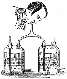Возьмем две склянки; у каждой из них по два горлышка, одно из которых соединяет ее с другой склянкой посредством особой изогнутой трубки, а другое - с наружным воздухом. Из этих склянок с трубками собран прибор, который при всей своей простоте позволяет сделать изящный и убедительный опыт; этот прибор заставит воздух двигаться только в одном направлении, а не обратно, когда я буду дышать через среднюю отводную трубку.В первой банке налита простая вода, во второй - известковая. Входя в первую склянку, воздух будет проходить ко мне в рот и легкие, давая мне возможность дышать, а на обратном пути из моих легких и рта сможет проходить только через вторую склянку с известковой водой. Как видите, комнатный воздух не изменил известковую воду; во второй склянке в известковую воду поступал только выдохнутый мною воздух, - и какова разница!