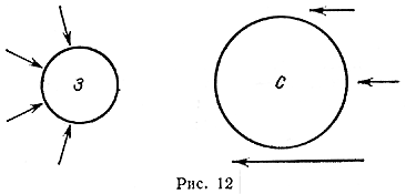 На рис. 12 С - Солнце, 3 - Земля. Если бы Солнца не было, то частицы обстреливали бы Землю со всех сторон, барабанили по ней и каждая упавшая частица немного подталкивала бы Землю. Это не сдвинет Землю ни в каком определенном направлении, потому что с одного боку налетает столько же частиц, сколько с другого, снизу столько же, сколько сверху. Однако если Солнце на месте, то оно в какой-то мере поглощает частицы, летящие с этой стороны, потому что некоторые из них, попадая в Солнце, не проходят его насквозь.