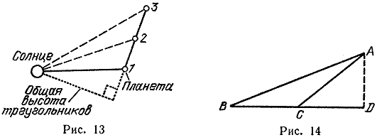 Рассмотрим Солнце и планету (рис. 13) и вообразим себе, что в определенный момент времени планета находится в положении 1. Она движется так, что через секунду, скажем, очутится в положении 2. Если бы Солнце не действовало на планету, то, согласно галилееву принципу инерции, планета продолжала бы двигаться по прямой. Тогда по истечении такого же промежутка времени, следующей секунды, двигаясь по прямой линии и пройдя такое же расстояние, планета очутилась бы в положении 3. Сначала мы докажем, что в равные промежутки времени описываются равные площади, если силы нет. Напомню, что площадь треугольника равна половине произведения основания на высоту, а высота - это расстояние по вертикали от вершины до основания треугольника. Если треугольник - тупоугольный (рис. 14), то высота - AD, а основание - ВС. Теперь сравним площади, которые описывались бы при движении планеты, если бы Солнце на нее не действовало (рис. 13).
