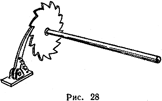 Представьте себе, что мы сделали какое-то устройство, которое, как нам известно, может работать лишь в одном направлении. Я, например, хочу сделать храповое колесо, т. е. зубчатое колесо, у которого ведущая кромка всех зубцов обрывается очень круто, а задняя полого сходит на нет. Колесо насажено на вал, и к нему пружиной (рис. 28) прижимается маленькая защелка (собачка), сидящая на своей собственной оси. Такое колесо может крутиться лишь в одну сторону. Если попытаться повернуть его обратно, собачка упрется в прямой срез зубца и не пустит его. При повороте же колеса в прямом направлении она с треском перескакивает с зубца на зубец - трак, трак, трак, ... (Вы знаете, о чем я говорю. Такие храповики используются в часах, в том числе и в наручных. При заводе часов они позволяют вам закручивать пружину и не дают ей потом раскручиваться.) Такой механизм полностью необратим в том смысле, что колесо не может вращаться в обратную сторону.