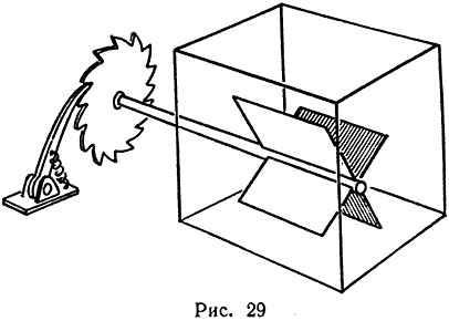 Так вот, предполагалось, что при помощи такого необратимого механизма, колеса, которое способно поворачиваться лишь в одну сторону, можно сделать одно очень полезное и интересное устройство. Как вам уже известно, в природе непрерывно происходит вечное хаотическое движение молекул, и если построить какой-нибудь очень чувствительный прибор, его стрелка будет постоянно дрожать, так как она все время находится под хаотическим обстрелом соседних молекул воздуха. Давайте же воспользуемся этим и посадим на вал нашего механизма четыре лопасти, как это показано на рис. 29.