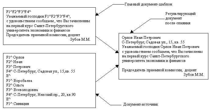 Главным документом может быть стандартная форма справки или приглашения, стандартное письмо, надписи на конверте, т.е. форма любого стандартного текста и т.д. Документ-источник должен представлять собой базу данных (или таблицу), состоящую из однотипных записей. В документе-источнике содержатся данные, которыми будет заполняться главный документ. Рассмотрим идею слияния документов на примере. Пример 13.1. Писать письма многочисленным адресатам одного и того же содержания - малоинтересное занятие. Текстовый процессор автоматизирует этот трудоемкий процесс, соединяя постоянную часть письма с данными, характеризующими адресатов. При этом пользователь должен создать специальный адресный файл. Адресный файл состоит из однотипных записей с именами и адресами клиентов. Каждая запись включает в себя определенное число полей, в которые записываются данные каждого клиента. Так, в первое поле всегда записывается фамилия, во второе - имя, а третье - отчество, в четвертое - адрес и т. п. Допустим, вы хотите разослать письма всем абитуриентам, сдавшим экзамены и поступившим в Университет в этом году. Для этого вы подготовьте общую часть письма и адресный файл всех зачисленных абитуриентов (рис, 13.6). В общей части письма специальными операторами (на рис. 13,6-этоF1^,F2^, F3^ и F4^) вы укажете, где и какие поля из адресного файла должны быть помещены для каждого получателя. В результате текстовый процессор автоматически напечатает вам все письма, содержащие помимо основной части адрес и данные каждого абитуриента.