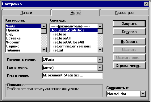 Окно "Изменить меню" позволяет выбрать пункт главного меню, в котором производится добавление или удаление команд, при этом указывается местоположение изменения - в окне "Где в меню".