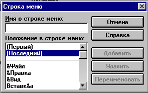 В поле "Имя в строке меню" вводится имя нового пункта, указывается его местоположение - первый, последний и нажимается кнопка <Добавить> или выделяется пункт меню, за которым осуществляется добавление, и нажимается кнопка <Добавить после>.