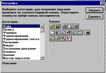 Затем выводится диалоговое окно "Настройка" для выбора категории кнопок и их расположения на новой панели инструментов. Кнопку можно графически отредактировать - кнопка <Правка> вызывает диалоговое окно "Редактор кнопки".