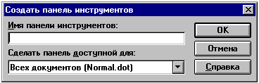 Для создания панели инструментов в Word 6.0 выполняется команда ВИД, Панели инструментов и нажимается кнопка <Создать>, в результате появляется диалоговое окно для указания имени и сферы действия новой панели инструментов (рис. 19.12).