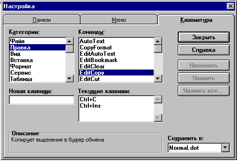 Для настройки "горячих" клавиш, например, в Word 6.0 выполняется команда СЕРВИС, Настройка, на вкладке Клавиатура выбирается категория объекта и определенный представитель категории - команда, которому можно назначить любое сочетание клавиши (<Alt>, <Ctrl> или <Shift>) и произвольной буквы или цифры. В качестве категории выступают также: макро, шрифты, элементы автотекста, стили, спецсимволы (рис. 19.13).