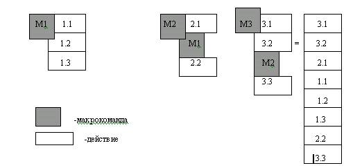 Все действия пользователя - выбор пунктов меню, опций в диалоговых окнах - протоколируются системой и записываются средствами языка WordBasic. Во время записи макрокоманды разрешен запуск других макрокоманд, которые, в свою очередь, могут использовать другие вложенные макрокоманды.