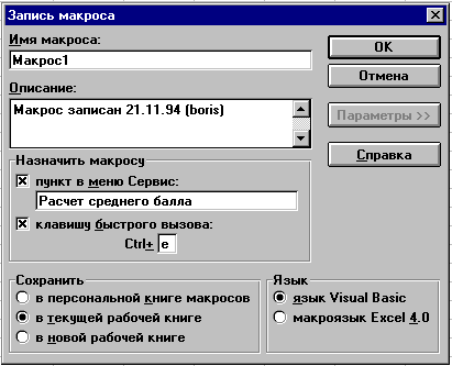 Создаваемый макрос может быть сохранен в персональной книге макросов (PERSONAL.XLS), общей для ряда рабочих книг одного автора или в текущей рабочей книге. Автоматически создается новый рабочий лист, на который записывается текст макроса на выбранном языке программирования - Visual Basic или макроязыке Excel 4.0. Макросы можно также размещать в отдельной рабочей книге, которая создается автоматически под стандартным именем ВООК#.