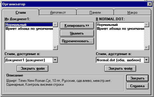 Клавишные и языковые макрокоманды сохраняются в определенном шаблоне документов. С помощью команды ФАЙЛ, Шаблоны или СЕРВИС, Макрокоманда вызывается диалоговое окно LОрганизатор¦, которое обеспечивает копирование, переименование и удаление макрокоманд на уровне шаблонов документов.